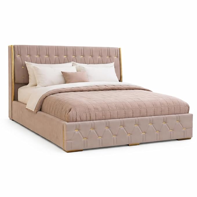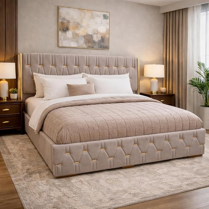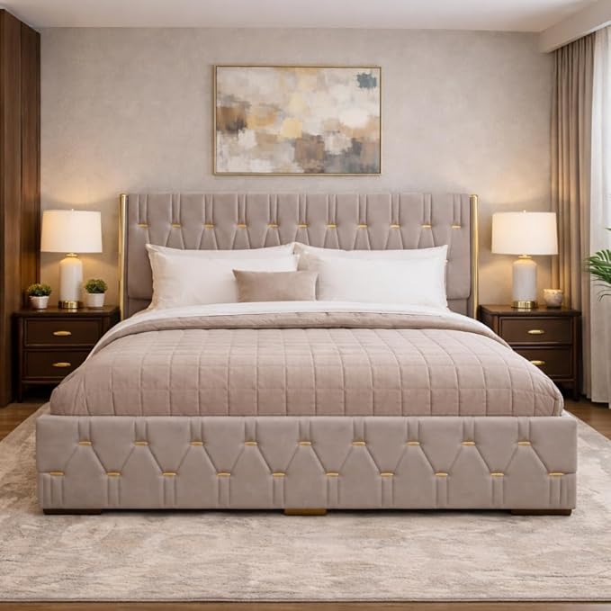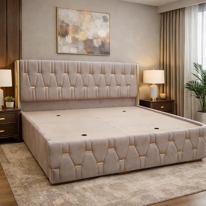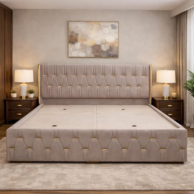 King Size Bed Dimensions: Length 84 X Width 75 X Height 47, Recommended Mattress Size: 78X72 Inch (Not Included) Premium Sheesham Wood Construction – Made from high-quality solid Sheesham wood, this king size wooden bed offers excellent strength, long-lasting durability, and a rich natural finish for everyday use. Elegant Upholstered Headboard Design – Soft Royal Aura-finish upholstery enhances comfort for reading or relaxing, while adding a luxurious and modern touch to your bedroom décor. Spacious Box Storage Bed – Built-in storage compartment provides ample space to store quilts, pillows, clothes, and other essentials, making this platform bed perfect for space-saving bedrooms. DIY Assembly Required – This upholstered king size bed comes with all necessary fittings and instructions; assembly is required and to be completed by the customer on a DIY basis.